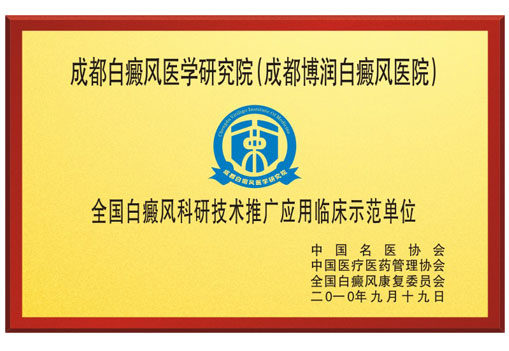 作为国家在西南重点设置的白癜风理论科研与临床诊疗机构,院承担着西南上亿人民群众皮肤健康的责任与全国先进白癜风科研技术在西南地区的落地与推广应用2011年9月经中国名医协会、中国医疗医药管理协会、全国白癜风康复委员会的三方权威考评,颁于成都白癜风医学研究院附属博润医院“全国白癜风科研技术推广应用临床示范基地”的称号